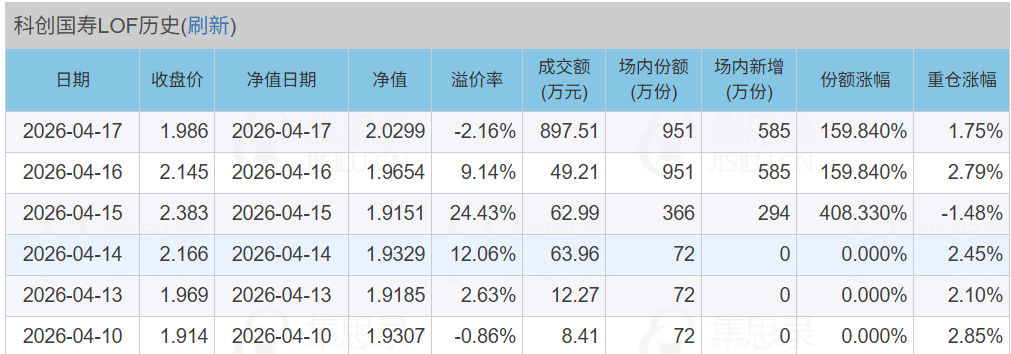 转折发生在4月13日,当日,科创国寿LOF成交了12.27万元,场内涨幅为2.87%。随后4月14日和15日,科创国寿LOF强势拉出两个涨停,瞬间吸引了场内投资者的目光。